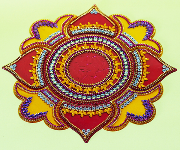 In Indian culture Rangoli is used for decorating the surroundings. Traditionally Rangoli used to be made from natural resources like flowers, rice paste, natural colours etc. Traditional rangolis were elaborate, time consuming and needed specific skills to make, with changing lifestyles people have less time and skill to draw rangolis elaborately. At Tridal we started making Rangolis using acrylic, wood and foam. Using these materials as base, different shapes are decorated with pearls, kundan, stone, chains, thread and foam flowers. These are ready to use decorative rangolis are in demand throughout the year. During festival seasons these products are in very high demand.